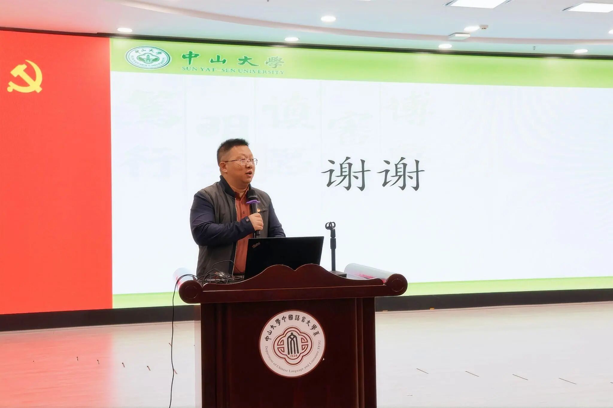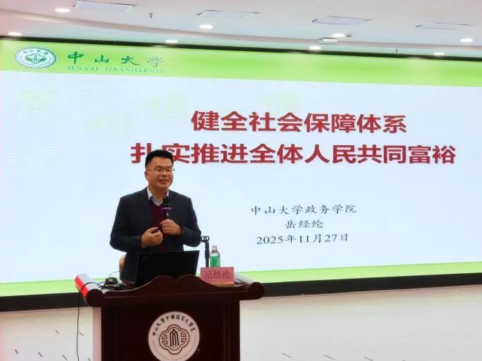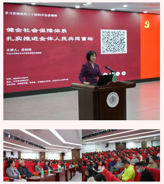 11月27日下午,外国语学院党委、六合彩资料 党委、中国语言文学系党委、社会学与人类学学院党委联合举办学习贯彻党的二十届四中全会精神专题讲座,邀请了政治与公共事务管理学院岳经纶教授主讲“健全社会保障体系,扎实推进全体人民共同富裕”专题报告。讲座会场设在中文堂105讲学厅,四个院系的党委理论学习中心组成员、师生党员、入党积极分子、发展对象等300余人参加学习。讲座由外国语学院党委书记张东蕙主持。