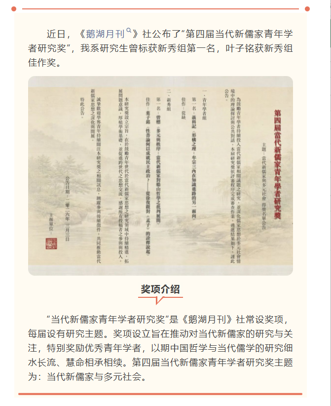 喜讯丨我系研究生曾标、叶子铭获“当代新儒家青年学者研究奖”